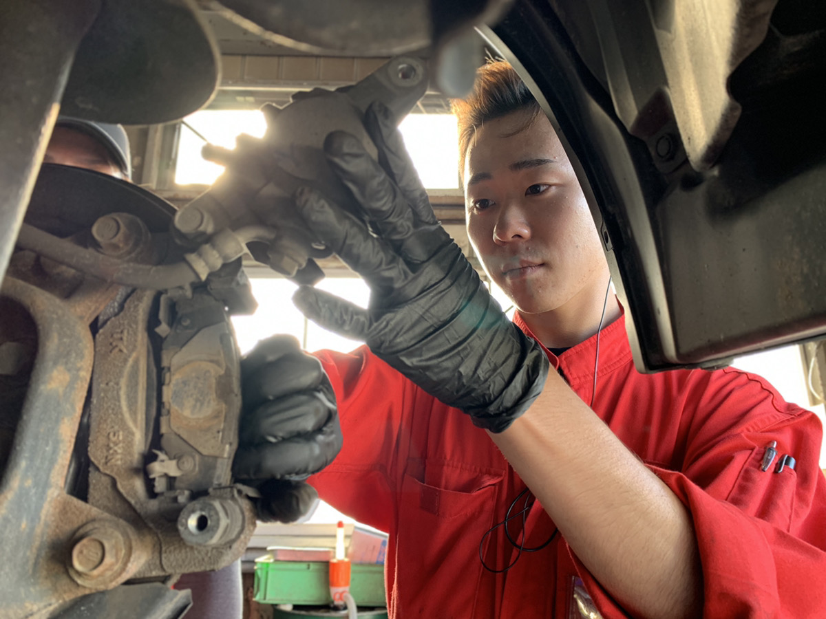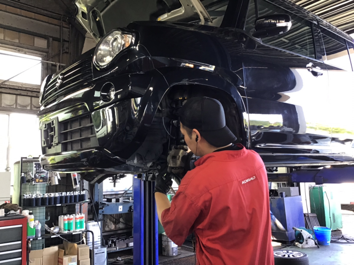 整備記録簿に基づき、ディーラー車検と同じ法定56項を点検します。外装・フロントガラス・信号用具の点検後にエンジンルームの点検を行います。